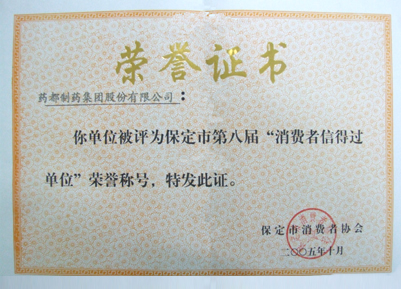 2006年3月15日,河北省消费协会为我公司颁发河北省第八届“消费者信得过单位”证书。