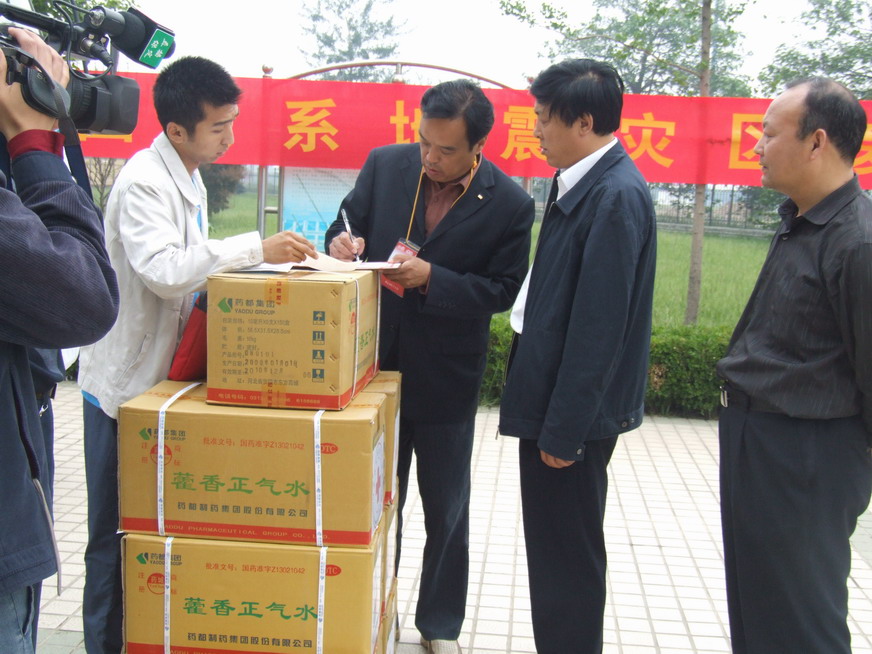 2008年5月16日,药都集团向四川地震灾区捐献的价值100万元的药品通过保定市红十字会发往灾区。16日上午保定市红十字会彭秘书长一行来我集团办理捐赠药品的交接手续,安国市副市长张彦安参加了交接仪式。在简短的交接仪式后,载满药都集团全体员工救灾热情的药品捐赠车立即开往保定火车站。