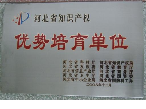 2008年12月,我公司被河北省科技厅、河北省知识产权局、河北省发改委、河北省教育厅、河北省信息产业厅、河北省商务厅、河北省卫生厅、河北省国资委、河北省中小企业局、河北省国防科工办评为“河北省知识产权优势培育单位”。