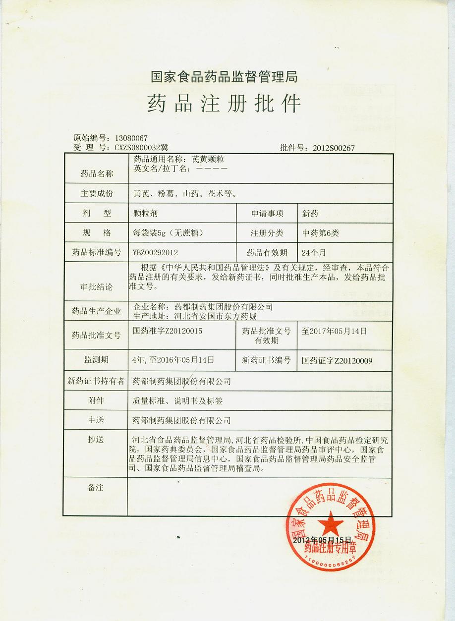 2012年5月15日,我公司新产品芪黄颗粒取得国家食品药品监督管理局药品注册批件,并颁发新药证书。