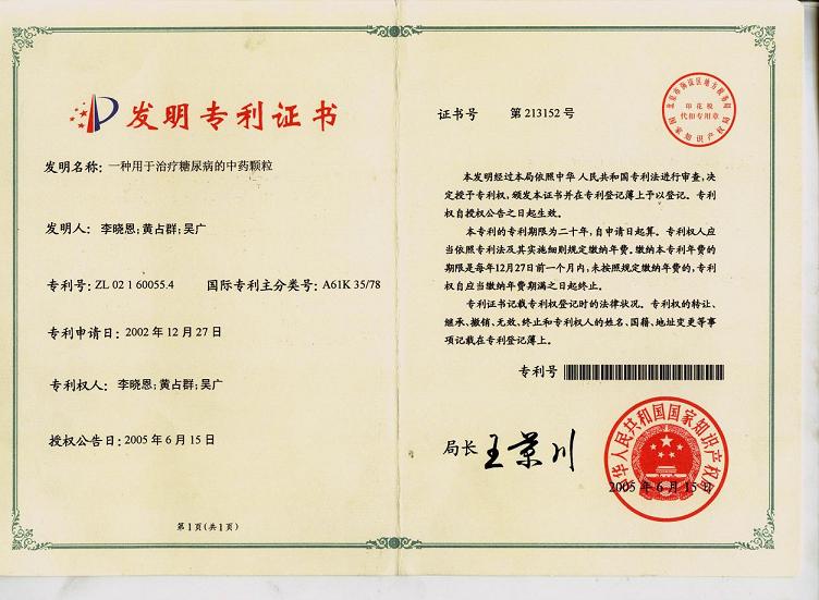 芪黄颗粒是我公司自主开发研制的产品,具有自主知识产权。自1999年开始,我公司利用现有的科研优势和关于糖尿病治疗的相关基础资料,参阅中医大量有价值的文献资料,汲取典型配方精华,经过药理、毒理研究和三期临床试验,研制出在糖尿病治疗中有显著疗效的芪黄颗粒中药六类新药(原中药三类新药)。2011年5月,通过国家食品药品监督管理局有关专家进行现场检查和抽样,2012年5月,我公司芪黄颗粒取得了药品注册批件和新药证书。