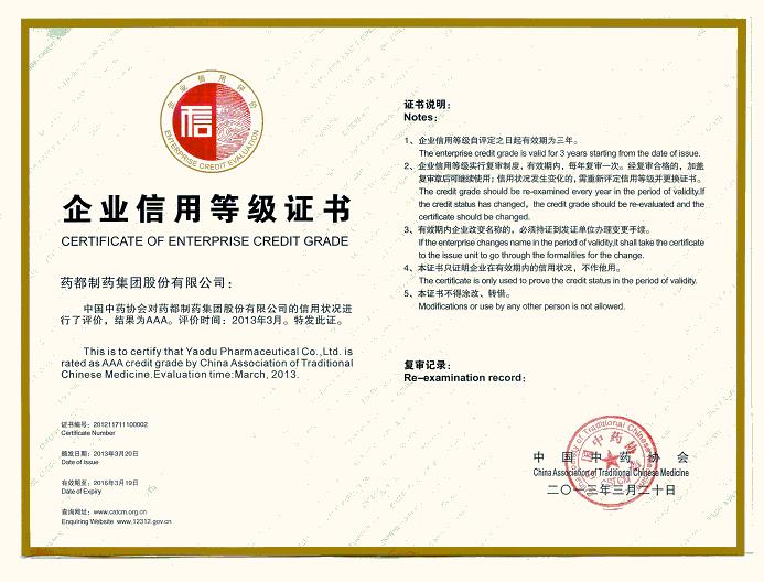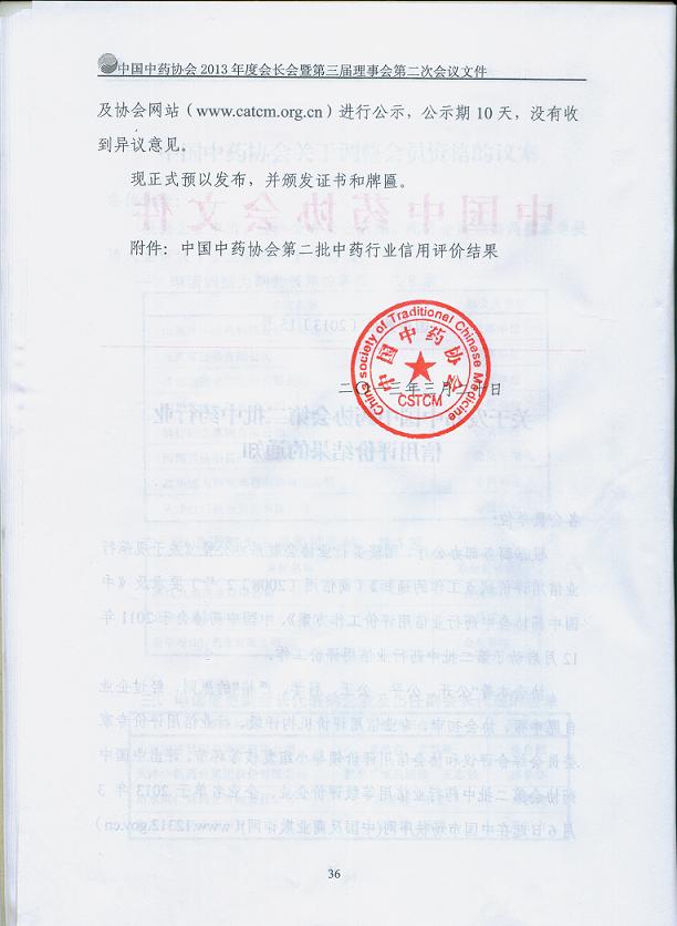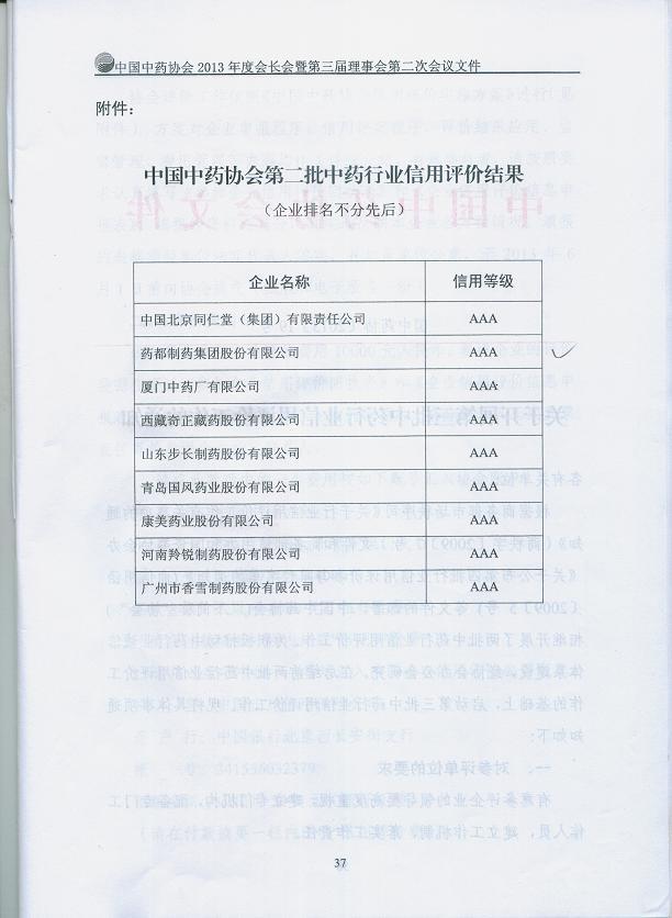 根据中国中药协会《关于开展第二批中药行业企业信用评价工作的通知》(国中药协〔2011〕46号)文件精神,我公司参加了第二批中药行业信用评价工作。中国中药协会本着“公开、公平、公正、科学、严格”的原则,经过协会初审、专业信用评价机构评级、行业信用评价专家委员会综合评议和协会信用评价领导小组复核等环节,评出包括我公司在内的9家AAA级信用企业,并将企业名单于2013年3月6日起在中国市场秩序网(中国反商业欺诈网)(www.12312.gov.cn)及中国中药协会网站(www.catcm.org.cn)进行了公示。