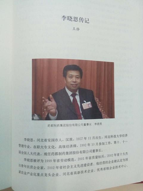 由保定市企业家协会编纂,保定市市长马誉峰、保定市企业家协会会长、政协保定市第十届主席王庆明作序的《创业史-保定企业》丛书第一集已由吉林大学出版社正式出版发行。该书旨在为企业歌功颂德,为企业家树碑立传,药都制药集团董事长李晓恩先生的个人传记被收录其中。