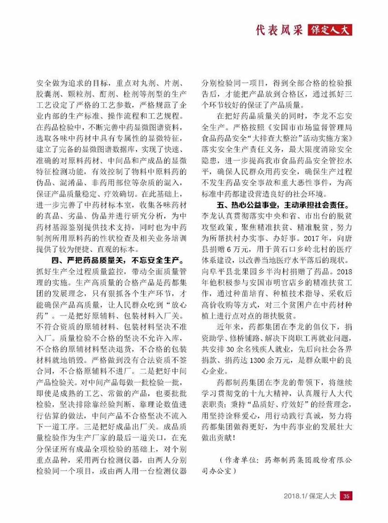 李龙,保定市人大代表,药都制药集团股份有限公司总经理。一直以来,他都非常珍惜人大代表这一荣誉, 始终牢记人大代表的使命,自觉践行人大代表的职责,在经营好企业的同时,始终把自己放在为广大群众代 言的位置,不负群众的信任和重托,认真履行人大代表的神圣职责,做到情为群众所系,利为群众所谋,用 自己的真情和汗水赢得群众的信任和赞誉。